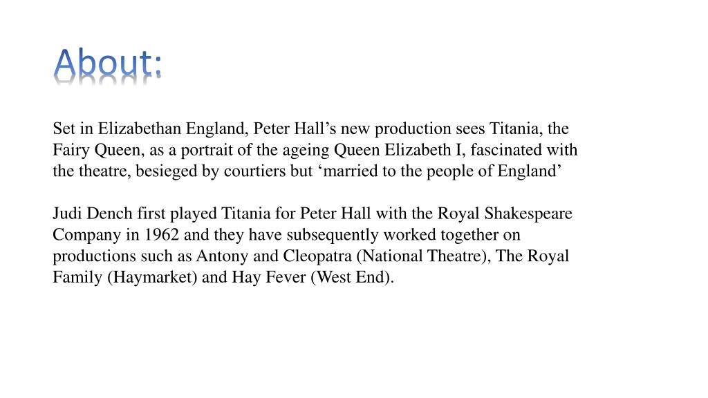 About: Set in Elizabethan England, Peter Hall’s new production sees Titania, the Fairy Queen, as a portrait of the ageing Queen Elizabeth I, fascinated with the theatre, besieged by courtiers but ‘married to the people of England’ Judi Dench first played Titania for Peter Hall with the Royal Shakespeare Company in 1962 and they have subsequently worked together on productions such as Antony and Cleopatra (National Theatre), The Royal Family (Haymarket) and Hay Fever (West End).