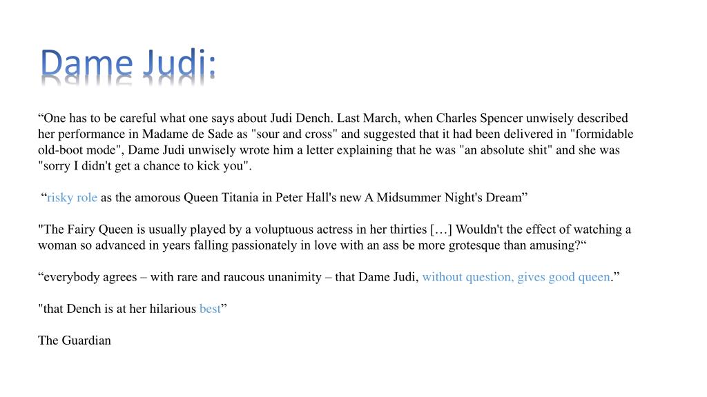 Dame Judi: “One has to be careful what one says about Judi Dench. Last March, when Charles Spencer unwisely described her performance in Madame de Sade as "sour and cross" and suggested that it had been delivered in "formidable old-boot mode", Dame Judi unwisely wrote him a letter explaining that he was "an absolute shit" and she was "sorry I didn't get a chance to kick you". “risky role as the amorous Queen Titania in Peter Hall's new A Midsummer Night's Dream” "The Fairy Queen is usually played by a voluptuous actress in her thirties […] Wouldn't the effect of watching a woman so advanced in years falling passionately in love with an ass be more grotesque than amusing?“ “everybody agrees – with rare and raucous unanimity – that Dame Judi, without question, gives good queen.” "that Dench is at her hilarious best” The Guardian