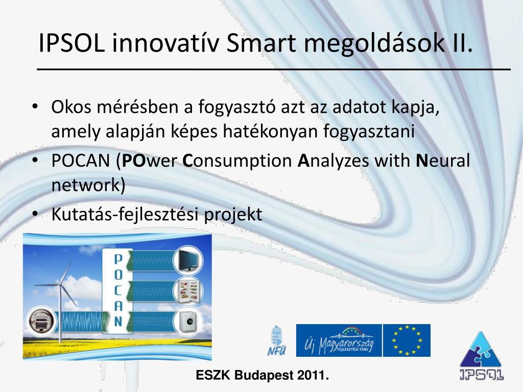 IPSOL innovatív Smart megoldások II. • Okos mérésben a fogyasztó azt az adatot kapja, amely alapján képes hatékonyan fogyasztani • POCAN (POwer Consumption Analyzes with Neural network) • Kutatás-fejlesztési projekt