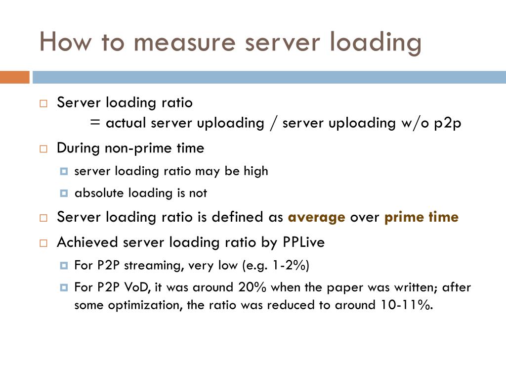 How to measure server loading Server loading ratio = actual server uploading / server uploading w/o p2p During non-prime time server loading ratio may be high absolute loading is not Server loading ratio is defined as average over prime time Achieved server loading ratio by PPLive For P2P streaming, very low (e.g. 1-2%) For P2P VoD, it was around 20% when the paper was written; after some optimization, the ratio was reduced to around 10-11%.