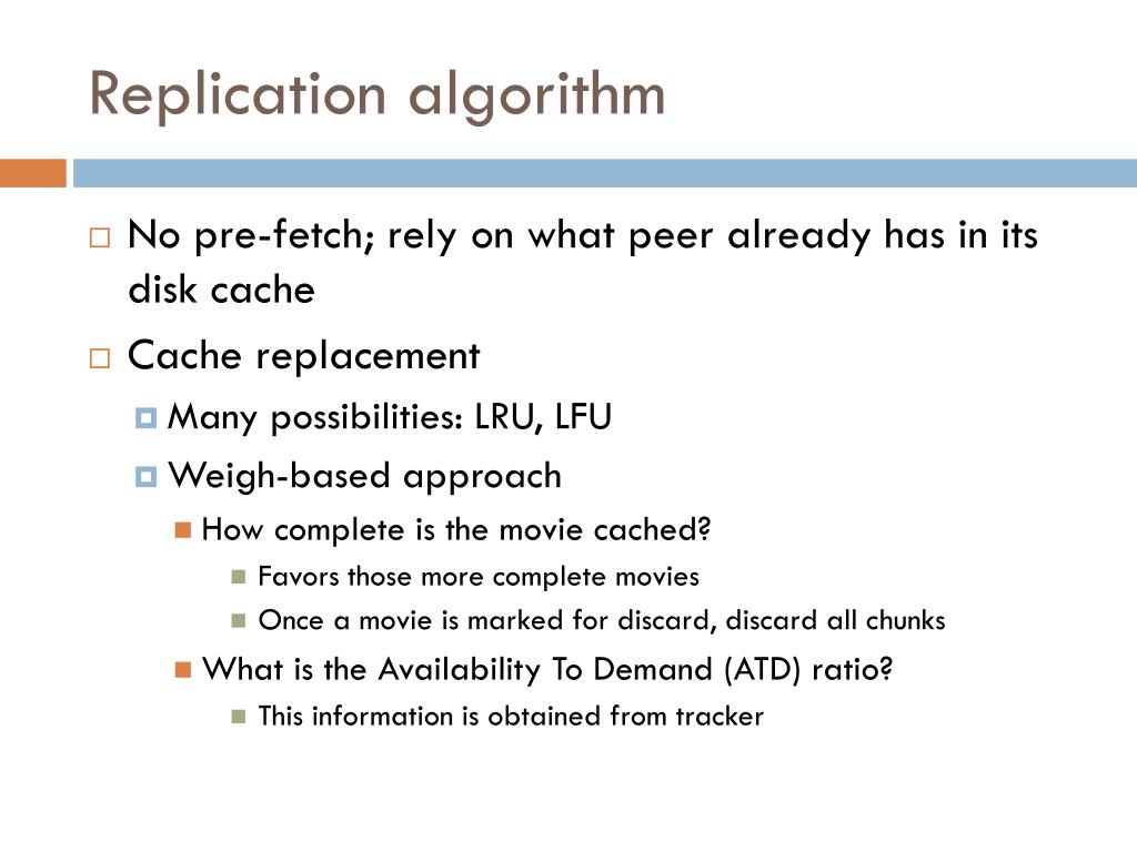 Replication algorithm No pre-fetch; rely on what peer already has in its disk cache Cache replacement Many possibilities: LRU, LFU Weigh-based approach How complete is the movie cached? Favors those more complete movies Once a movie is marked for discard, discard all chunks What is the Availability To Demand (ATD) ratio? This information is obtained from tracker