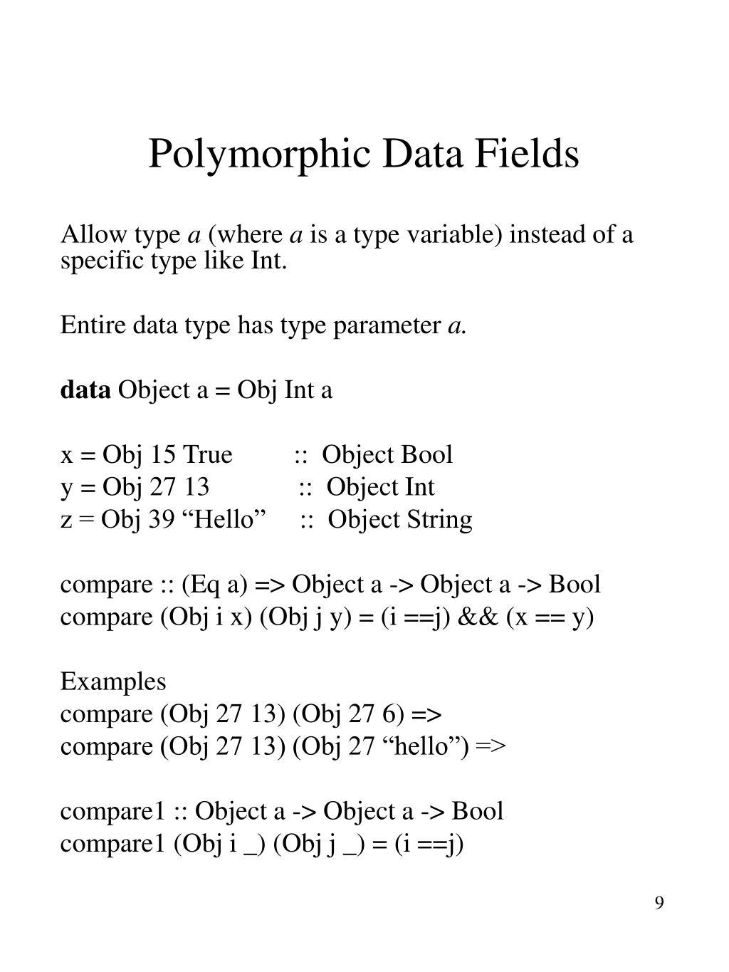 Polymorphic Data Fields Allow type a (where a is a type variable) instead of a specific type like Int. Entire data type has type parameter a. data Object a = Obj Int a x = Obj 15 True :: Object Bool y = Obj 27 13 :: Object Int z = Obj 39 “Hello” :: Object String compare :: (Eq a) => Object a -> Object a -> Bool compare (Obj i x) (Obj j y) = (i ==j) && (x == y) Examples compare (Obj 27 13) (Obj 27 6) => compare (Obj 27 13) (Obj 27 “hello”) => compare1 :: Object a -> Object a -> Bool compare1 (Obj i _) (Obj j _) = (i ==j)