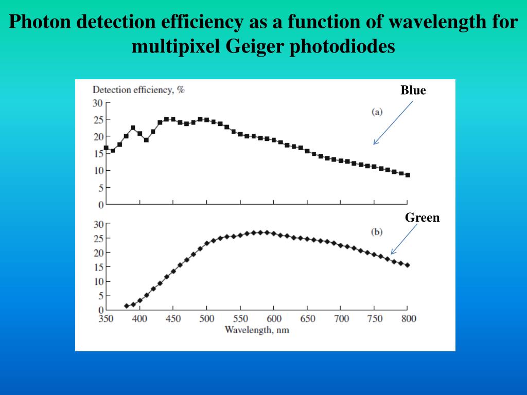 Photon detection efficiency as a function of wavelength for multipixel Geiger photodiodes Blue Green
