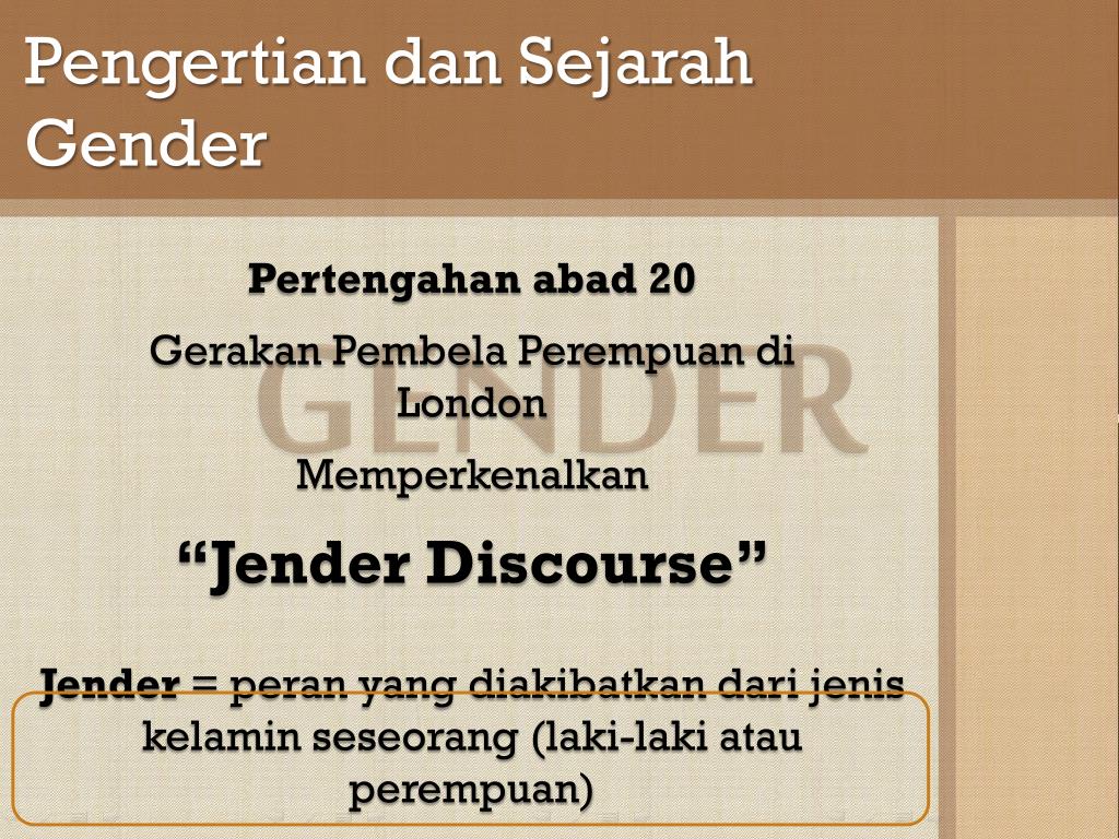 Pengertian dan Sejarah Gender Jender = peran yang diakibatkan dari jenis kelamin seseorang (laki-laki atau perempuan) Pertengahan abad 20 Gerakan Pembela Perempuan di London Memperkenalkan “Jender Discourse” GENDER