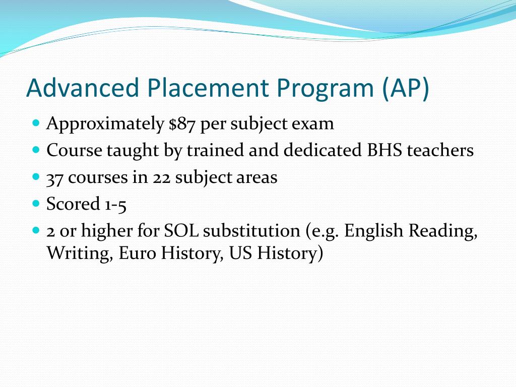 Advanced Placement Program (AP) • Approximately $87 per subject exam • Course taught by trained and dedicated BHS teachers • 37 courses in 22 subject areas • Scored 1-5 • 2 or higher for SOL substitution (e.g. English Reading, Writing, Euro History, US History)