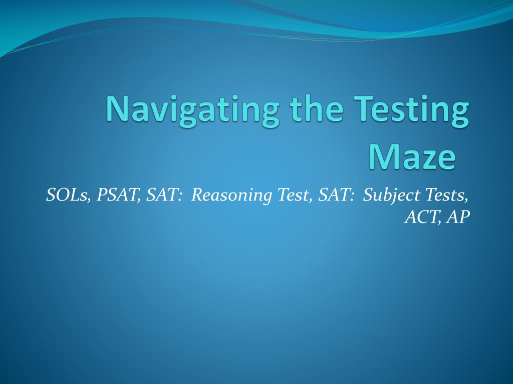 Navigating the Testing Maze SOLs, PSAT, SAT: Reasoning Test, SAT: Subject Tests, ACT, AP