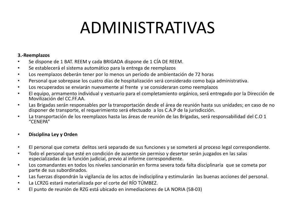 ADMINISTRATIVAS 3.-Reemplazos • Se dispone de 1 BAT. REEM y cada BRIGADA dispone de 1 CÍA DE REEM. • Se establecerá el sistema automático para la entrega de reemplazos • Los reemplazos deberán tener por lo menos un período de ambientación de 72 horas • Personal que sobrepase los cuatro días de hospitalización será considerado como baja administrativa. • Los recuperados se enviarán nuevamente al frente y se consideraran como reemplazos • El equipo, armamento individual y vestuario para el completamiento orgánico, será entregado por la Dirección de Movilización del CC.FF.AA. • Las Brigadas serán responsables por la transportación desde el área de reunión hasta sus unidades; en caso de no disponer de transporte, el requerimiento será efectuado a los C.A.P de la jurisdicción. • La transportación de los reemplazos hasta las áreas de reunión de las Brigadas, será responsabilidad del C.O 1 “CENEPA” • Disciplina Ley y Orden • El personal que cometa delitos será separado de sus funciones y se someterá al proceso legal correspondiente. • Todo el personal que esté en condición de ausente sin permiso y desertor serán juzgados en las salas especializadas de la función judicial, previo al informe correspondiente. • Los comandantes en todos los niveles sancionarán en forma severa toda falta disciplinaria que se cometa por parte de sus subordinados. • Las fuerzas dispondrán la vigilancia de los actos de indisciplina y estimularán las buenas acciones del personal. • La LCRZG estará materializada por el corte del RÍO TÚMBEZ. • El punto de reunión de RZG está ubicado en inmediaciones de LA NORIA (58-03)