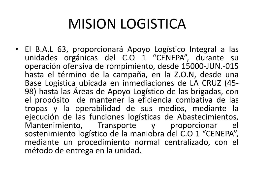 MISION LOGISTICA • El B.A.L 63, proporcionará Apoyo Logístico Integral a las unidades orgánicas del C.O 1 “CENEPA”, durante su operación ofensiva de rompimiento, desde 15000-JUN.-015 hasta el término de la campaña, en la Z.O.N, desde una Base Logística ubicada en inmediaciones de LA CRUZ (45-98) hasta las Áreas de Apoyo Logístico de las brigadas, con el propósito de mantener la eficiencia combativa de las tropas y la operabilidad de sus medios, mediante la ejecución de las funciones logísticas de Abastecimientos, Mantenimiento, Transporte y proporcionar el sostenimiento logístico de la maniobra del C.O 1 “CENEPA”, mediante un procedimiento normal centralizado, con el método de entrega en la unidad.