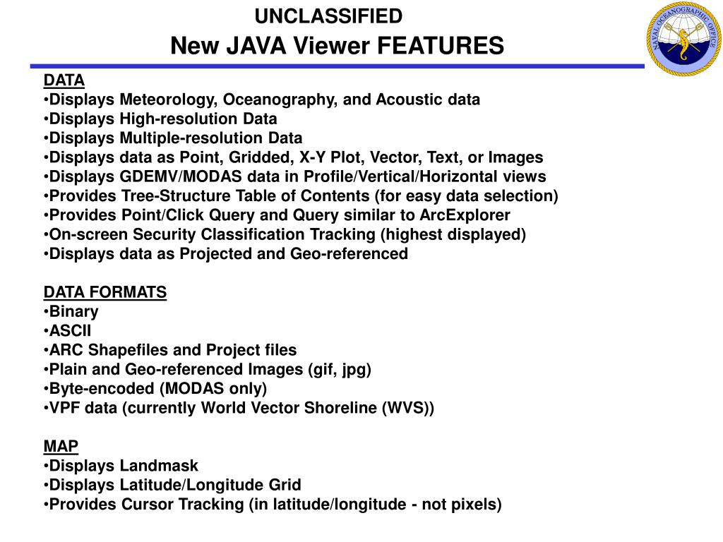 UNCLASSIFIED New JAVA Viewer FEATURES • DATA • Displays Meteorology, Oceanography, and Acoustic data • Displays High-resolution Data • Displays Multiple-resolution Data • Displays data as Point, Gridded, X-Y Plot, Vector, Text, or Images • Displays GDEMV/MODAS data in Profile/Vertical/Horizontal views • Provides Tree-Structure Table of Contents (for easy data selection) • Provides Point/Click Query and Query similar to ArcExplorer • On-screen Security Classification Tracking (highest displayed) • Displays data as Projected and Geo-referenced • DATA FORMATS • Binary • ASCII • ARC Shapefiles and Project files • Plain and Geo-referenced Images (gif, jpg) • Byte-encoded (MODAS only) • VPF data (currently World Vector Shoreline (WVS)) • MAP • Displays Landmask • Displays Latitude/Longitude Grid • Provides Cursor Tracking (in latitude/longitude - not pixels)