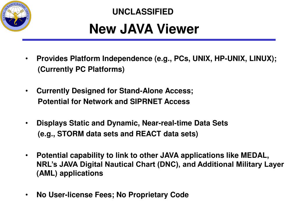 Provides Platform Independence (e.g., PCs, UNIX, HP-UNIX, LINUX); (Currently PC Platforms) Currently Designed for Stand-Alone Access; Potential for Network and SIPRNET Access Displays Static and Dynamic, Near-real-time Data Sets (e.g., STORM data sets and REACT data sets) Potential capability to link to other JAVA applications like MEDAL, NRL’s JAVA Digital Nautical Chart (DNC), and Additional Military Layer (AML) applications No User-license Fees; No Proprietary Code UNCLASSIFIED New JAVA Viewer
