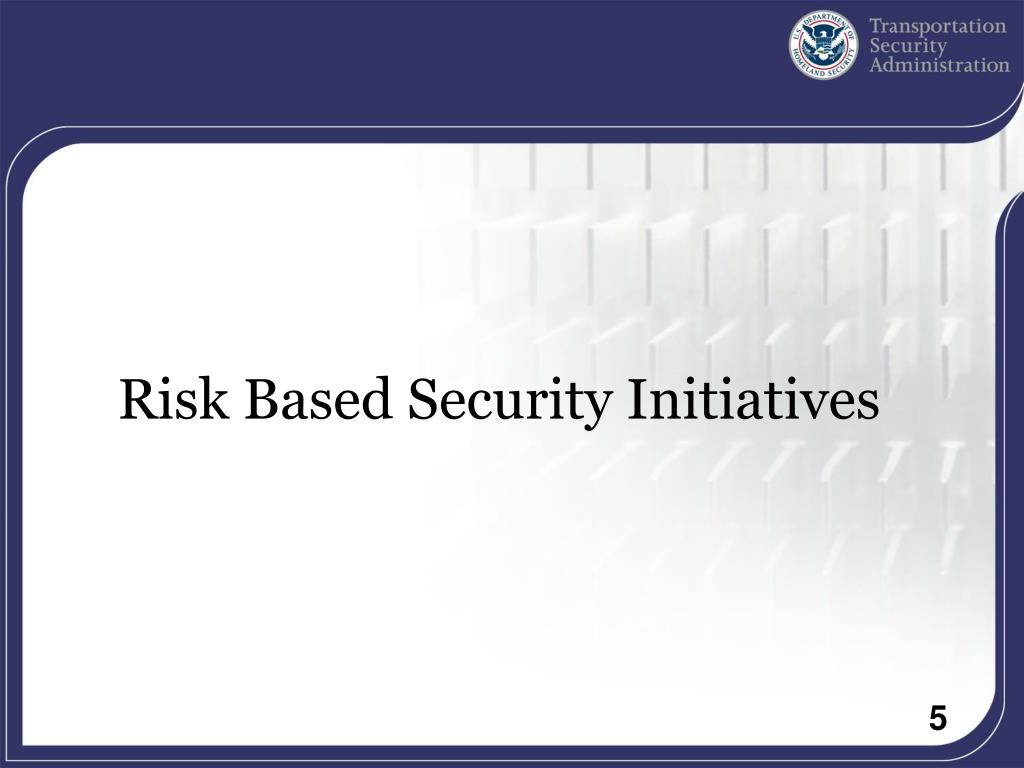 Risk-Based Passenger Security Overview TSA is undertaking efforts to focus its resources and improve the passenger experience at airport security checkpoints by applying new intelligence-driven, risk-based screening procedures and enhancing its use of technology. Guiding Principles of Risk-Based Security The majority of airline passengers are low risk. The more information available on each passenger, the easier it is to assess risk. Behavior detection and interviewing techniques should be strengthened in the screening process. TSA must accelerate its efforts to optimize screening processes and use of technology to gain system-wide efficiencies. Increase security by focusing on unknowns; expedite known/trusted travelers.