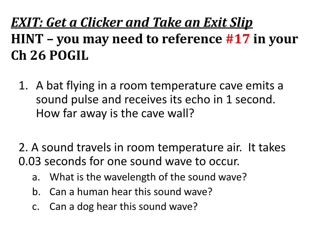 EXIT: Get a Clicker and Take an Exit SlipHINT – you may need to reference #17 in your Ch 26 POGIL • A bat flying in a room temperature cave emits a sound pulse and receives its echo in 1 second. How far away is the cave wall? 2. A sound travels in room temperature air. It takes 0.03 seconds for one sound wave to occur. • What is the wavelength of the sound wave? • Can a human hear this sound wave? • Can a dog hear this sound wave?