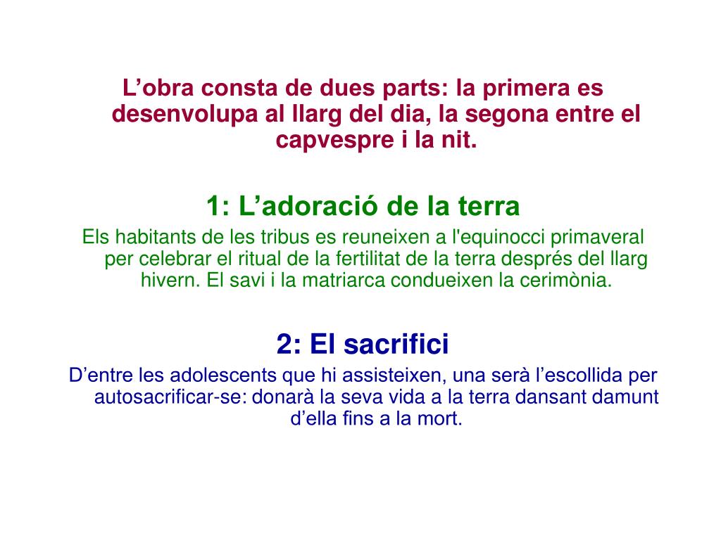 EL “LLIBRET” DE LA CONSAGRACIÓ. Ígor Stravinski - Nikolai Roerich. L’obra consta de dues parts: la primera es desenvolupa al llarg del dia, la segona entre el capvespre i la nit. 1: L’adoració de la terra