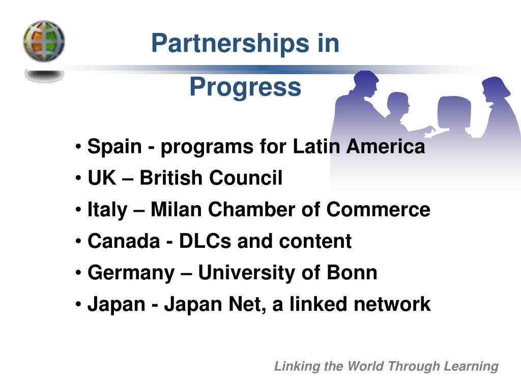 Partnerships in Progress • Spain - programs for Latin America • UK – British Council • Italy – Milan Chamber of Commerce • Canada - DLCs and content • Germany – University of Bonn • Japan - Japan Net, a linked network