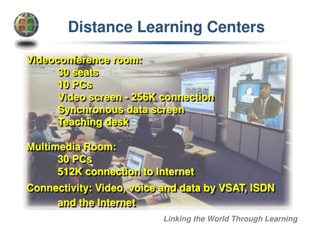 Distance Learning Centers Videoconference room: 30 seats 10 PCs Video screen - 256K connection Synchronous data screen Teaching desk Multimedia Room: 30 PCs 512K connection to Internet Connectivity: Video, voice and data by VSAT, ISDN and the Internet