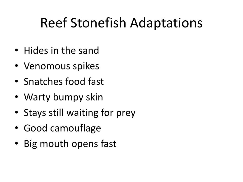Reef Stonefish Adaptations • Hides in the sand • Venomous spikes • Snatches food fast • Warty bumpy skin • Stays still waiting for prey • Good camouflage • Big mouth opens fast