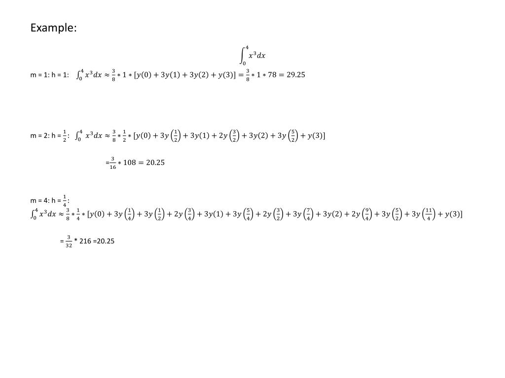 Conclusion: So we can see that the equation for the Simpson’s 3/8 Rule is: Each of the function values will be multiplied by 3 or 2 except for the first and the last. The number of subinterval points will need to be multiples of 3’s.