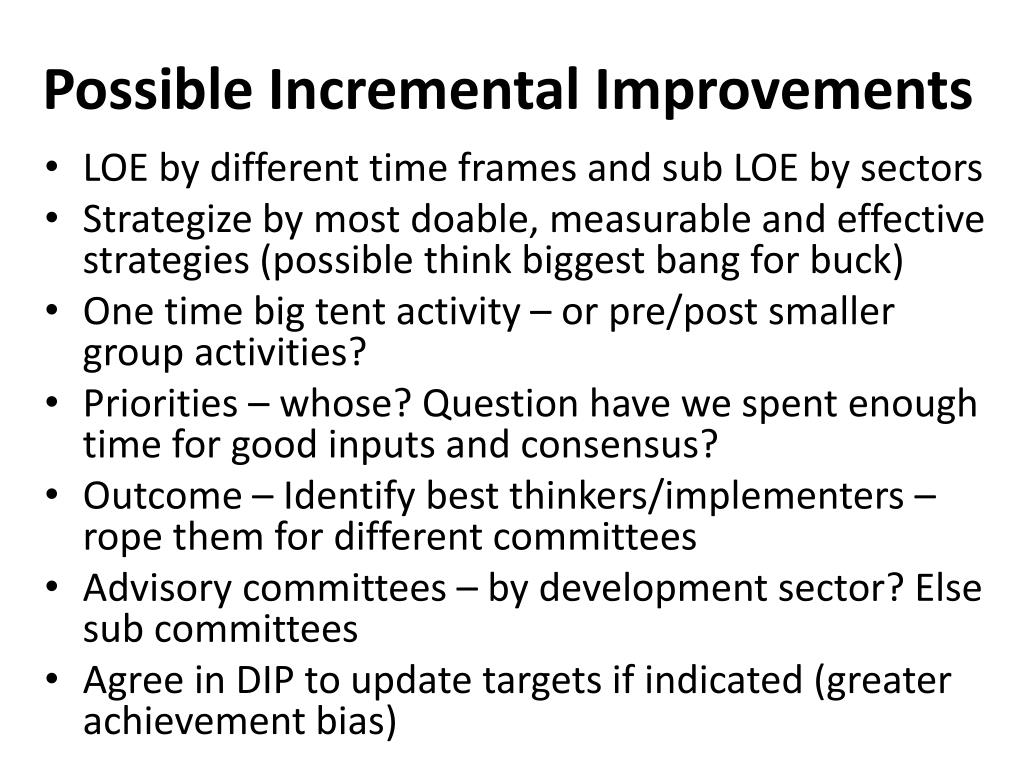 Possible Incremental Improvements • LOE by different time frames and sub LOE by sectors • Strategize by most doable, measurable and effective strategies (possible think biggest bang for buck) • One time big tent activity – or pre/post smaller group activities? • Priorities – whose? Question have we spent enough time for good inputs and consensus? • Outcome – Identify best thinkers/implementers – rope them for different committees • Advisory committees – by development sector? Else sub committees • Agree in DIP to update targets if indicated (greater achievement bias)