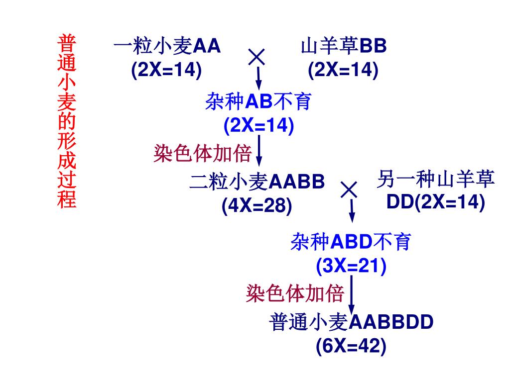 普通小麦的形成过程 一粒小麦AA (2X=14) 山羊草BB (2X=14) × 杂种AB不育 (2X=14) 染色体加倍 另一种山羊草DD(2X=14) 二粒小麦AABB (4X=28) × 杂种ABD不育 (3X=21) 染色体加倍 普通小麦AABBDD (6X=42)