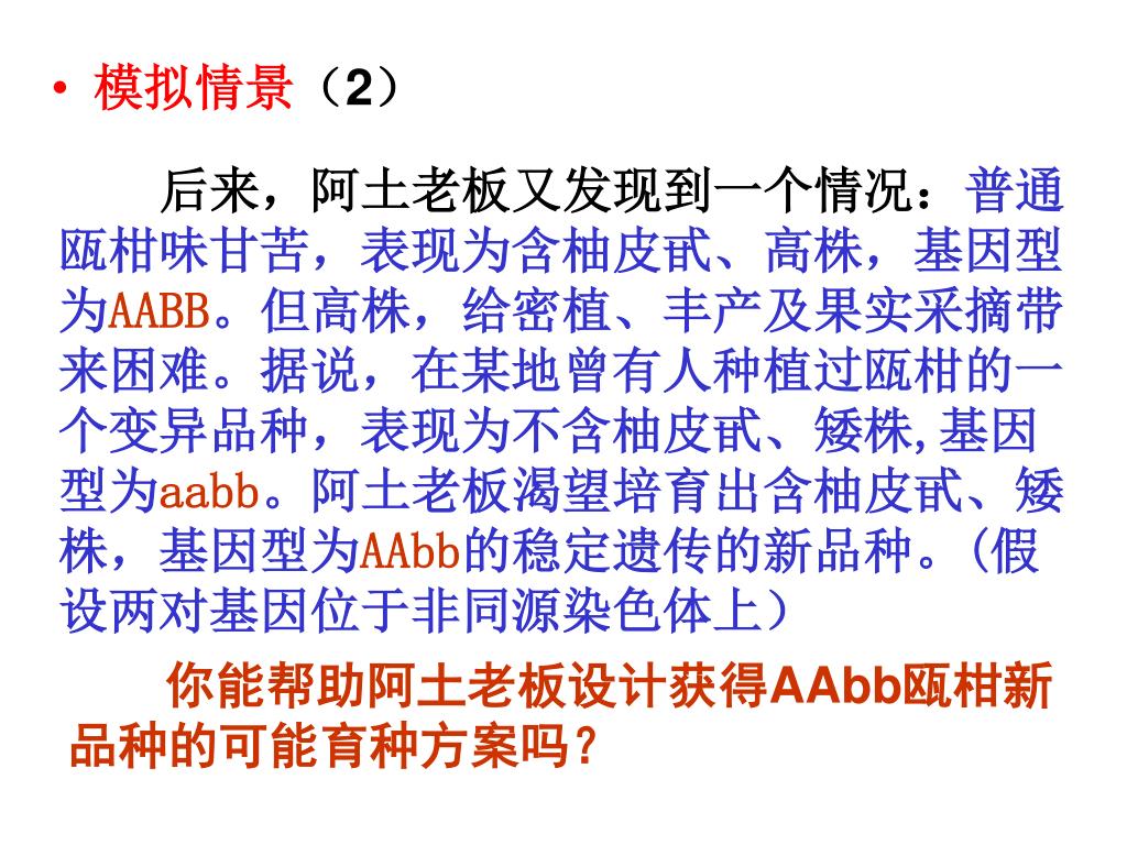 模拟情景(2) 后来,阿土老板又发现到一个情况:普通瓯柑味甘苦,表现为含柚皮甙、高株,基因型为AABB。但高株,给密植、丰产及果实采摘带来困难。据说,在某地曾有人种植过瓯柑的一个变异品种,表现为不含柚皮甙、矮株,基因型为aabb。阿土老板渴望培育出含柚皮甙、矮株,基因型为AAbb的稳定遗传的新品种。(假设两对基因位于非同源染色体上) 你能帮助阿土老板设计获得AAbb瓯柑新品种的可能育种方案吗?