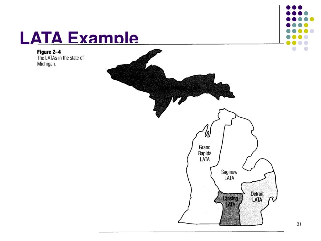 LATAs • Local Access and Transport Areas (LATAs) • 165 defined after divestiture • LECs provide service within LATA • Inter-LATA traffic provided by long distance companies • Examples: AT&T, WorldCom, and Sprint • Long distance companies called Interexchange Carriers (IXCs) • Important: Telecommunications Act of 1996 eliminated limits on types of traffic LECs and IXCs could carry • Beginning 1997, IXCs started offering local service and LECs began offering long distance service