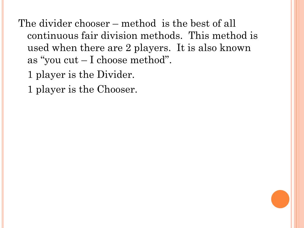 The divider chooser – method is the best of all continuous fair division methods. This method is used when there are 2 players. It is also known as “you cut – I choose method”. 1 player is the Divider. 1 player is the Chooser.