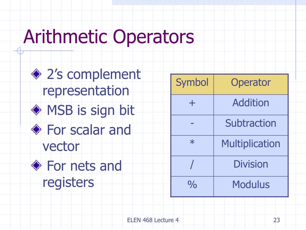 Arithmetic Operators • 2’s complement representation • MSB is sign bit • For scalar and vector • For nets and registers ELEN 468 Lecture 4