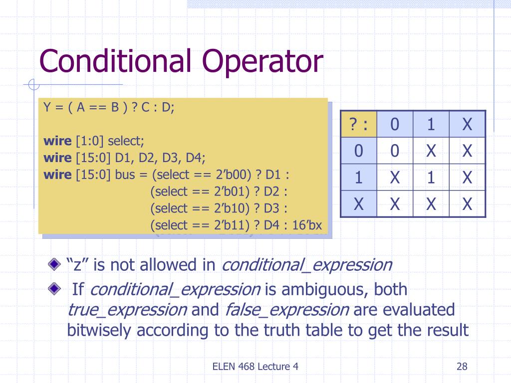 Y = ( A == B ) ? C : D; wire [1:0] select; wire [15:0] D1, D2, D3, D4; wire [15:0] bus = (select == 2’b00) ? D1 : (select == 2’b01) ? D2 : (select == 2’b10) ? D3 : (select == 2’b11) ? D4 : 16’bx “z” is not allowed in conditional_expression If conditional_expression is ambiguous, both true_expression and false_expression are evaluated bitwisely according to the truth table to get the result Conditional Operator ELEN 468 Lecture 4