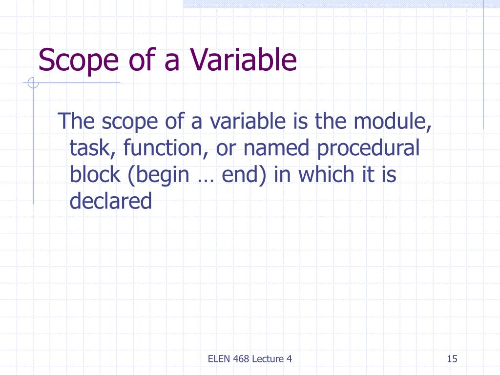 Scope of a Variable The scope of a variable is the module, task, function, or named procedural block (begin … end) in which it is declared ELEN 468 Lecture 4