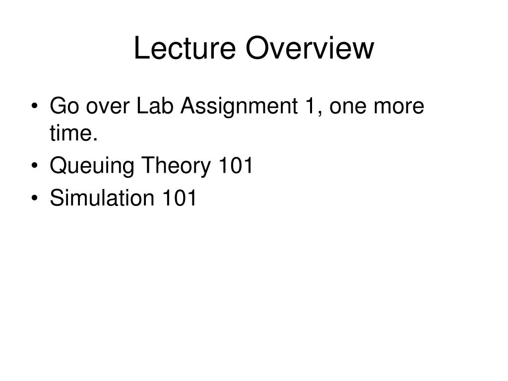 Lecture Overview • Go over Lab Assignment 1, one more time. • Queuing Theory 101 • Simulation 101