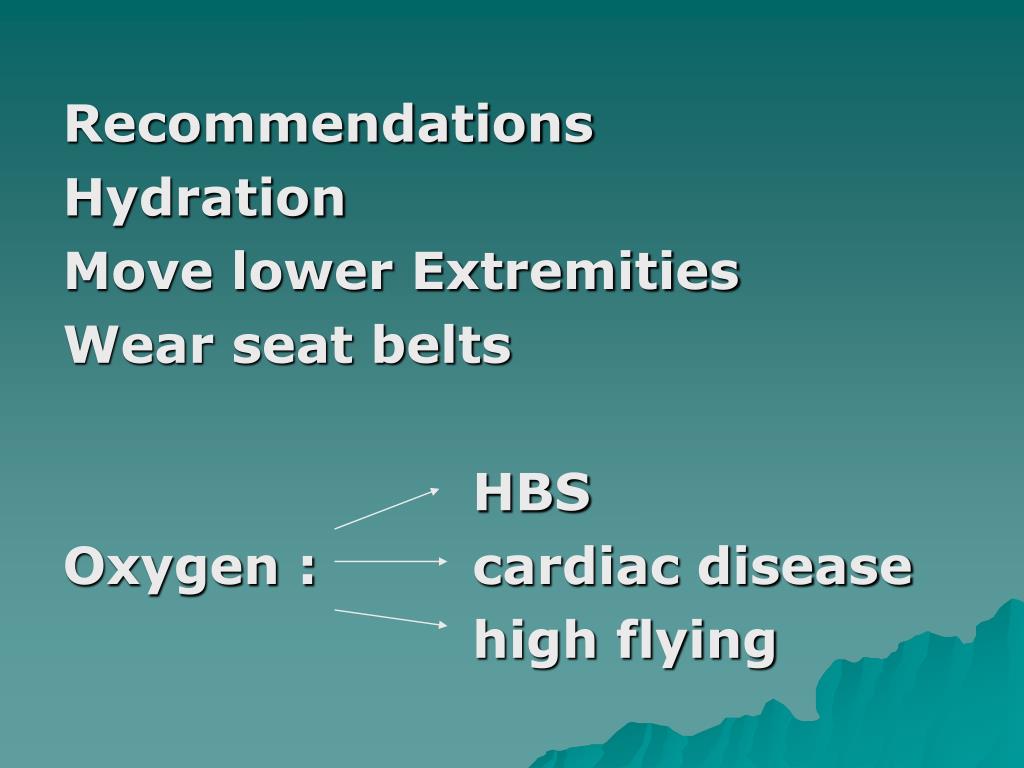 Recommendations Hydration Move lower Extremities Wear seat belts HBS Oxygen : cardiac disease high flying