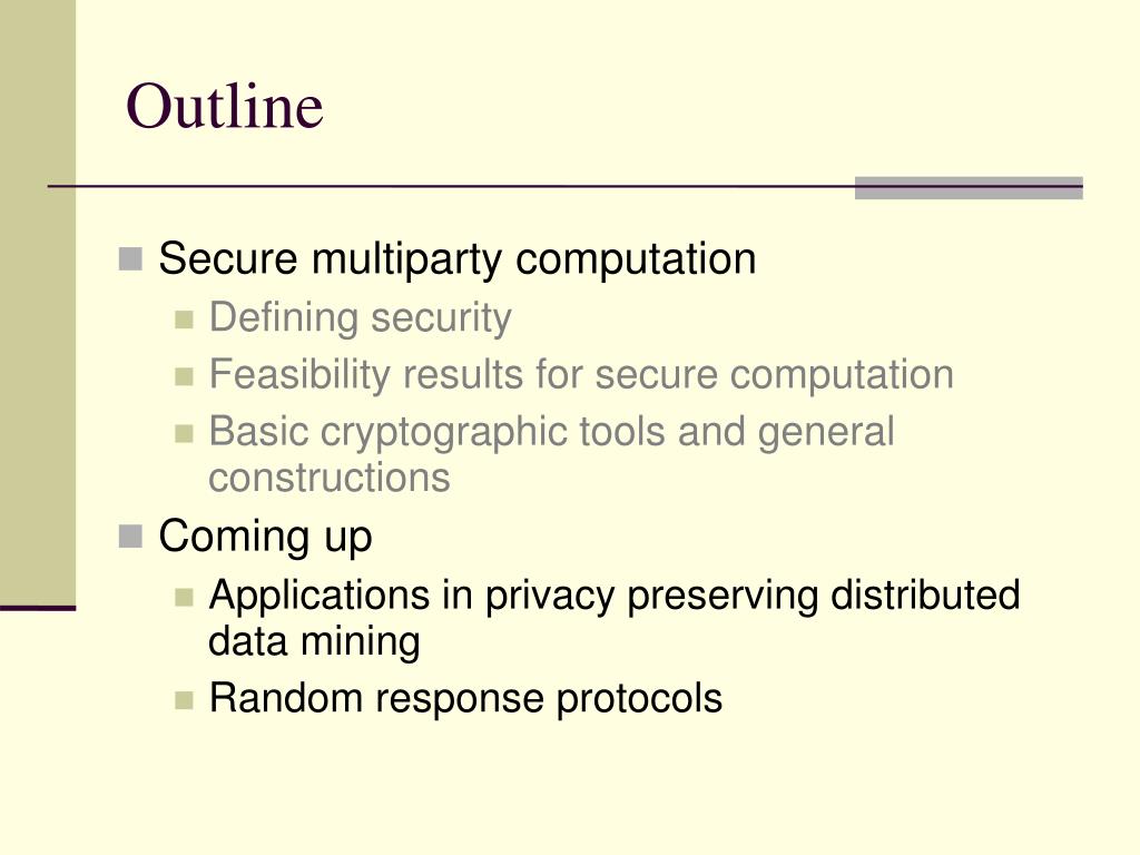 Outline Secure multiparty computation Defining security Feasibility results for secure computation Basic cryptographic tools and general constructions Coming up Applications in privacy preserving distributed data mining Random response protocols