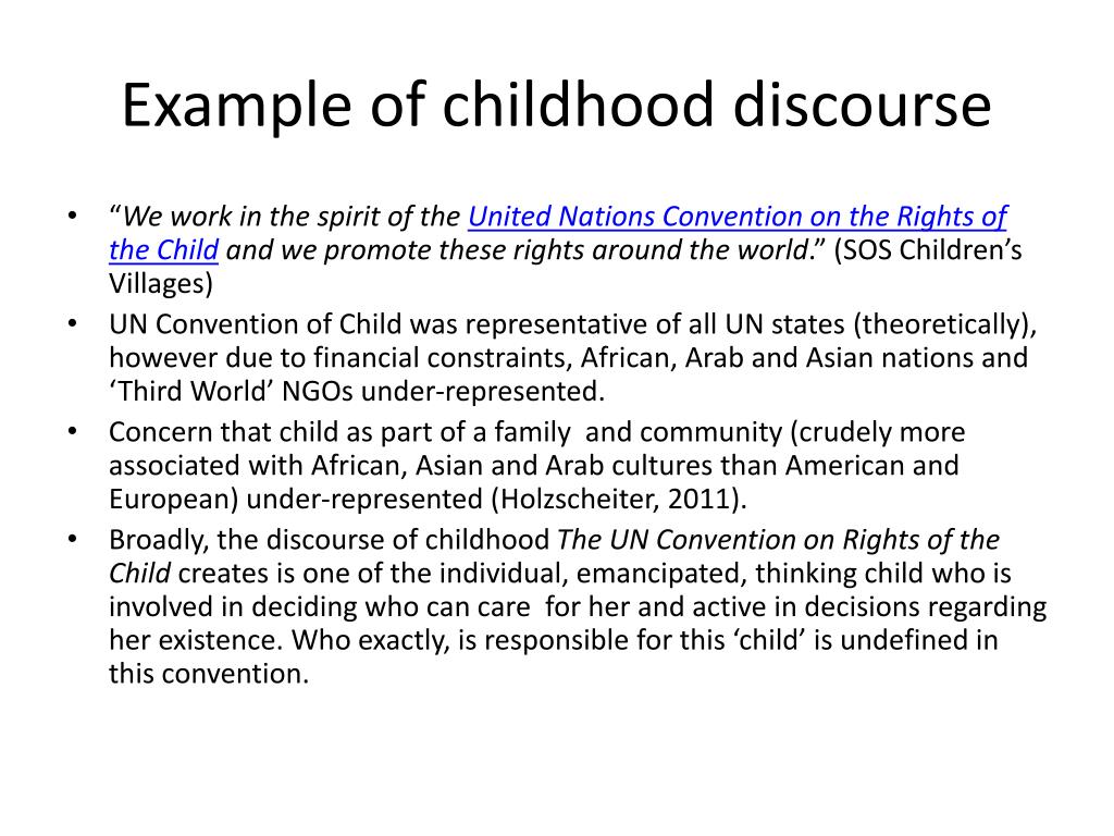 Example of childhood discourse • “We work in the spirit of the United Nations Convention on the Rights of the Child and we promote these rights around the world.” (SOS Children’s Villages) • UN Convention of Child was representative of all UN states (theoretically), however due to financial constraints, African, Arab and Asian nations and ‘Third World’ NGOs under-represented. • Concern that child as part of a family and community (crudely more associated with African, Asian and Arab cultures than American and European) under-represented (Holzscheiter, 2011). • Broadly, the discourse of childhood The UN Convention on Rights of the Child createsis one of the individual, emancipated, thinking child who is involved in deciding who can care for her and active in decisions regarding her existence. Who exactly, is responsible for this ‘child’ is undefined in this convention.
