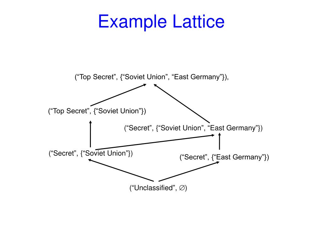 Example Lattice (“Top Secret”, {“Soviet Union”, “East Germany”}), (“Top Secret”, {“Soviet Union”}) (“Secret”, {“Soviet Union”, “East Germany”}) (“Secret”, {“Soviet Union”}) (“Secret”, {“East Germany”}) (“Unclassified”, )