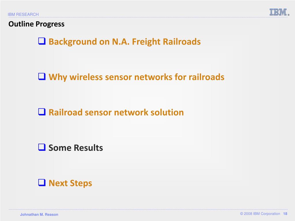 Outline Progress • Background on N.A. Freight Railroads • Why wireless sensor networks for railroads • Railroad sensor network solution • Some Results • Next Steps