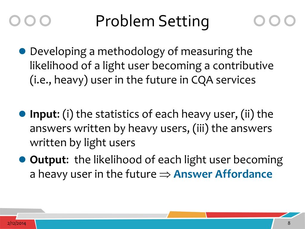 Problem Setting • Developing a methodology of measuring the likelihood of a light user becoming a contributive (i.e., heavy) user in the future in CQA services • Input: (i) the statistics of each heavy user, (ii) the answers written by heavy users, (iii) the answers written by light users • Output: the likelihood of each light user becoming a heavy user in the future Answer Affordance