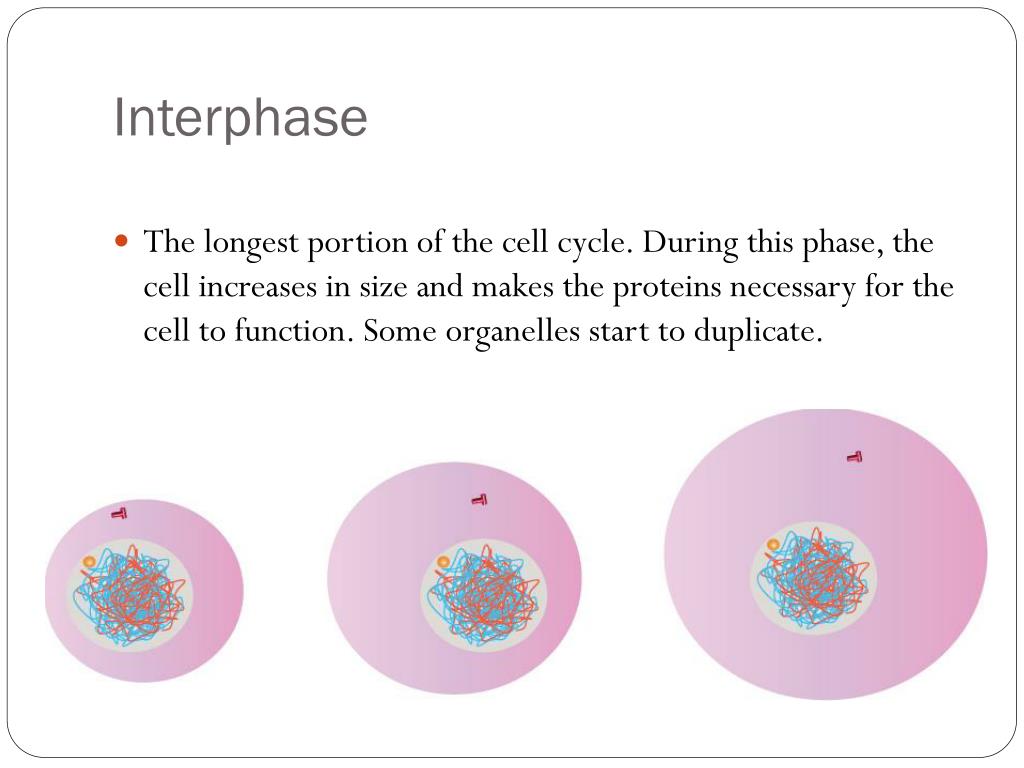 Interphase • The longest portion of the cell cycle. During this phase, the cell increases in size and makes the proteins necessary for the cell to function. Some organelles start to duplicate.
