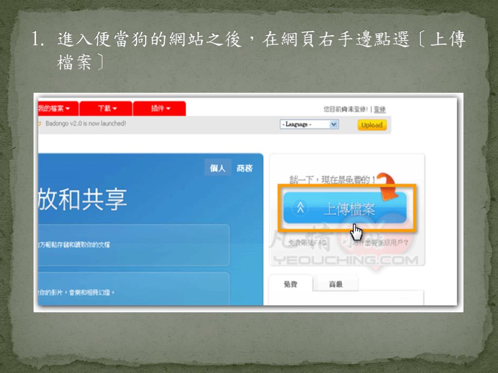 進入便當狗的網站之後,在網頁右手邊點選〔上傳檔案〕進入便當狗的網站之後,在網頁右手邊點選〔上傳檔案〕