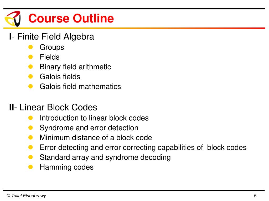 Course Outline I- Finite Field Algebra • Groups • Fields • Binary field arithmetic • Galois fields • Galois field mathematics II- Linear Block Codes • Introduction to linear block codes • Syndrome and error detection • Minimum distance of a block code • Error detecting and error correcting capabilities of block codes • Standard array and syndrome decoding • Hamming codes