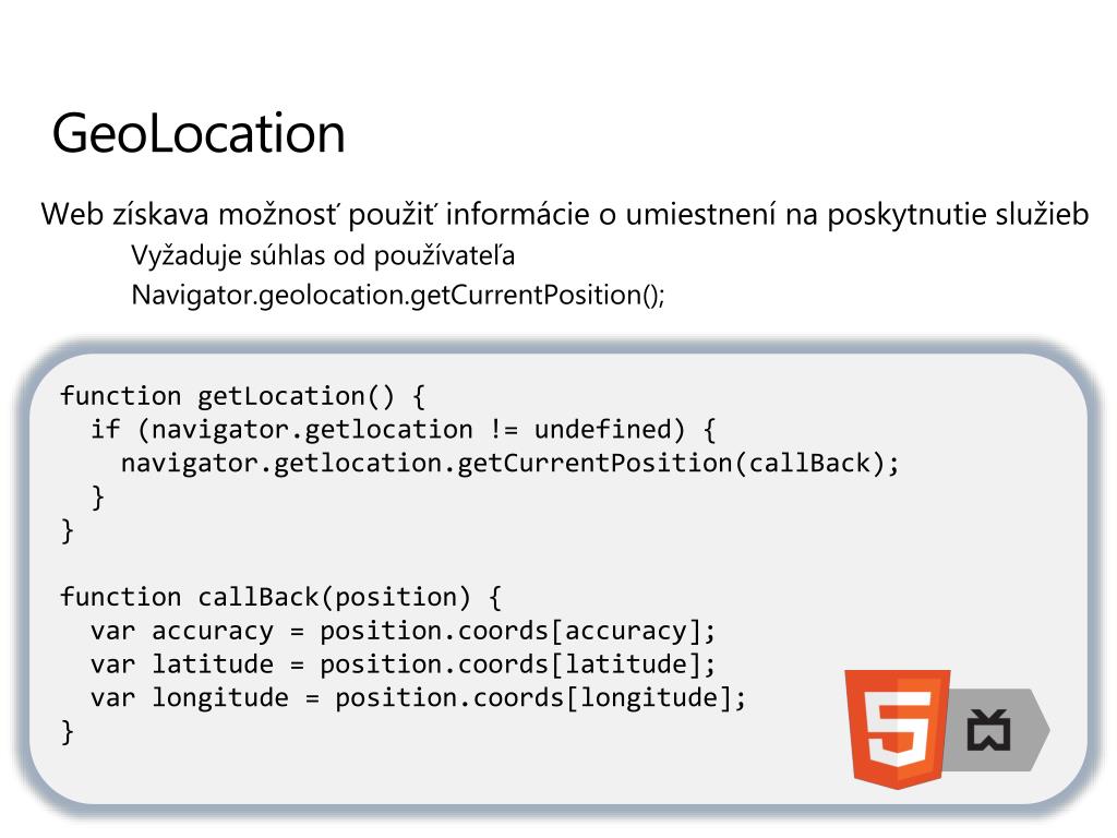 GeoLocation Web získava možnosť použiť informácie o umiestnení na poskytnutie služieb • Vyžaduje súhlas od používateľa • Navigator.geolocation.getCurrentPosition(); function getLocation() { if (navigator.getlocation != undefined) { navigator.getlocation.getCurrentPosition(callBack); } } function callBack(position) { var accuracy = position.coords[accuracy]; var latitude = position.coords[latitude]; var longitude = position.coords[longitude]; }