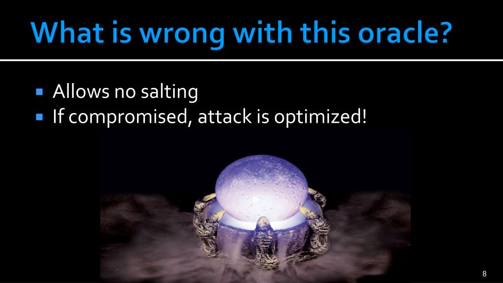 What is wrong with this oracle? • Allows no salting • If compromised, attack is optimized!