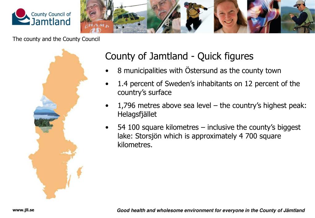 The county and the County Council • County of Jamtland- Quick figures • 8 municipalities with Östersund as the county town • 1.4 percent of Sweden’s inhabitants on 12 percent of the country’s surface • 1,796 metres above sea level – the country’s highest peak: Helagsfjället • 54 100square kilometres – inclusive the county’s biggest lake: Storsjön which is approximately4 700 square kilometres.