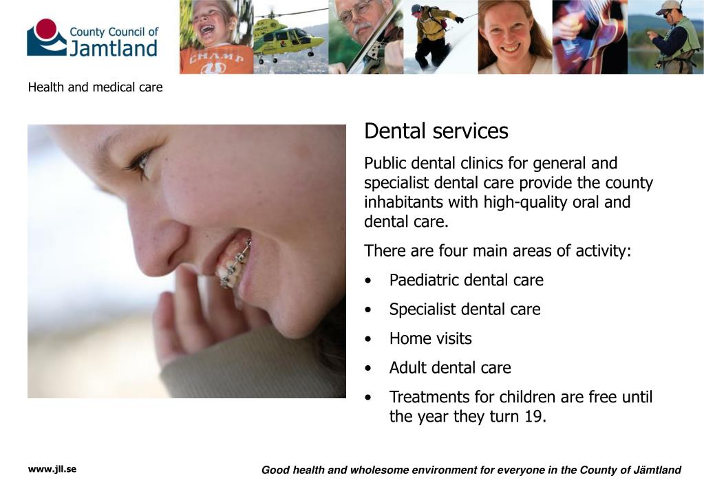 Health and medical care • Dental services • Public dental clinics for general and • specialist dental care provide the county • inhabitants with high-quality oral and • dental care. • There are four main areas of activity: • Paediatric dental care • Specialist dental care • Home visits • Adult dental care • Treatments for children are free until the year they turn 19.
