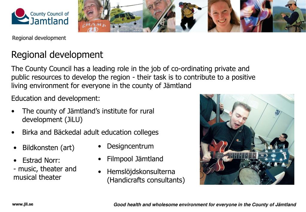 Regional development • Regional development • The County Council has a leading role in the job of co-ordinating private and • public resources to develop the region - their task is to contribute to a positive • living environment for everyone in the county of Jämtland • Education and development: • The county of Jämtland’s institute for rural development (JiLU) • Birka and Bäckedal adult education colleges • Designcentrum • Filmpool Jämtland • Hemslöjdskonsulterna(Handicraftsconsultants) • Bildkonsten (art) • Estrad Norr: • - music, theater and musical theater