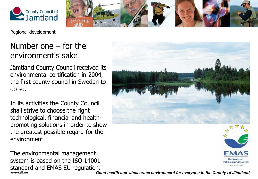 Regional development Number one – for the environment’s sake Jämtland County Council received its environmental certification in 2004, the first county council in Sweden to do so. In its activities the County Council shall strive to choose the right technological, financial and health-promoting solutions in order to show the greatest possible regard for the environment. The environmental management system is based on the ISO 14001 standard and EMAS EU regulation.