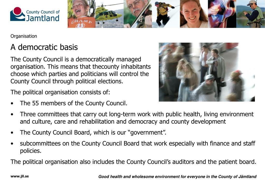 Organisation • A democratic basis • The County Council is a democratically managed • organisation. This means that thecounty inhabitants • choose which parties and politicians will control the • County Council through political elections. • The political organisation consists of: • The 55 members of the County Council. • Three committees that carry out long-term work with public health, living environment and culture, care and rehabilitation and democracy and county development • The County Council Board, which is our “government”. • subcommittees on the County Council Board that work especially with finance and staff policies. • The political organisation also includes the County Council’s auditors and the patient board.