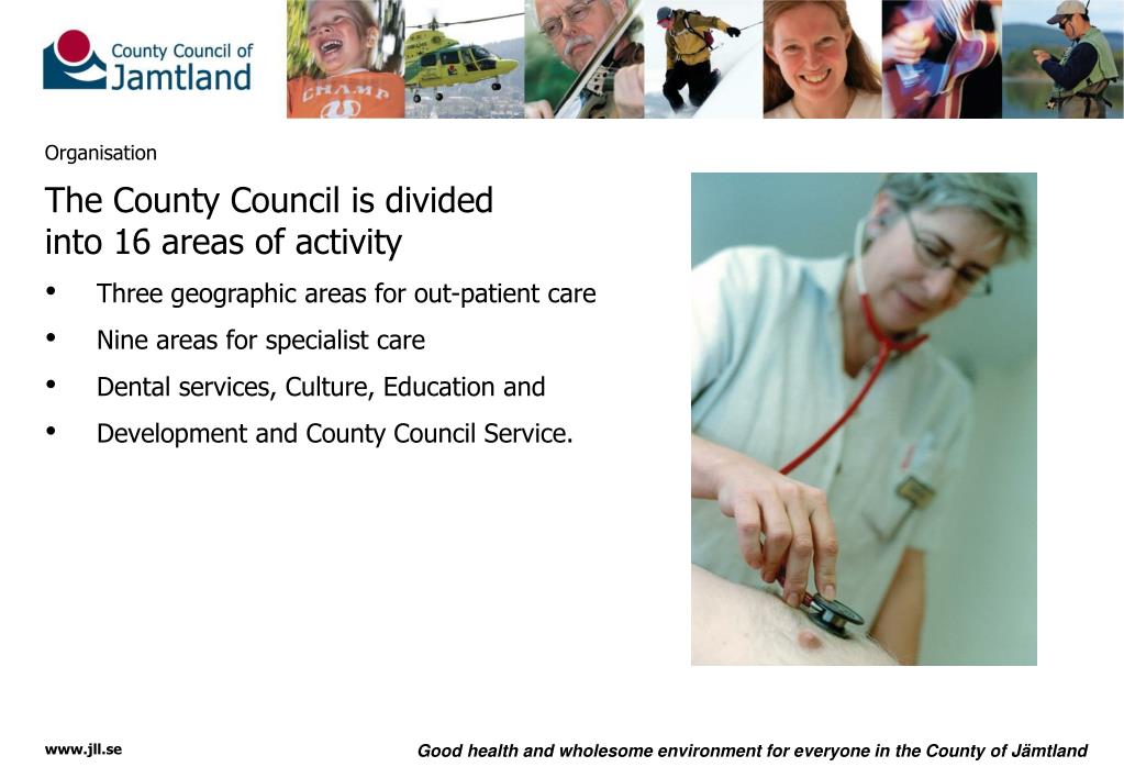 Organisation • The County Council is divided • into 16 areas of activity • Three geographic areas for out-patient care • Nine areas for specialist care • Dental services, Culture, Education and • Development and County Council Service.