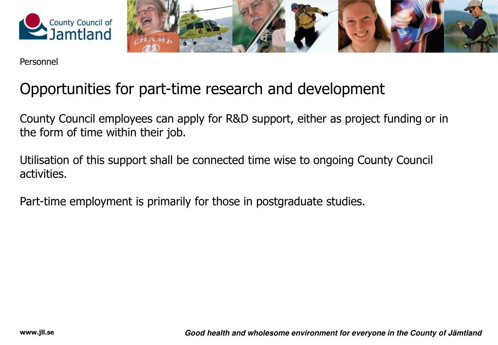 Personnel Opportunities for part-time research and development County Council employees can apply for R&D support, either as project funding or in the form of time within their job. Utilisation of this support shall be connected time wise to ongoing County Council activities. Part-time employment is primarily for those in postgraduate studies.