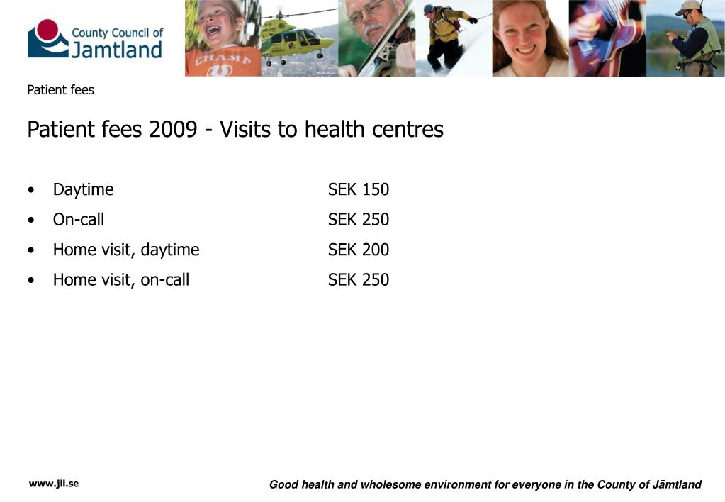 Patient fees • Patient fees 2009 - Visits to health centres • Daytime SEK 150 • On-call SEK 250 • Home visit, daytime SEK 200 • Home visit, on-call SEK 250