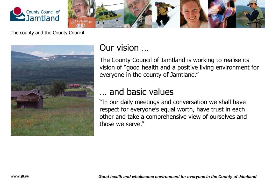 The county and the County Council Our vision … The County Council of Jamtland is working to realise its vision of “good health and a positive living environment for everyone in the county of Jamtland.” … and basicvalues “In our daily meetings and conversation we shall have respect for everyone’s equal worth, have trust in each other and take a comprehensive view of ourselves and those we serve.”